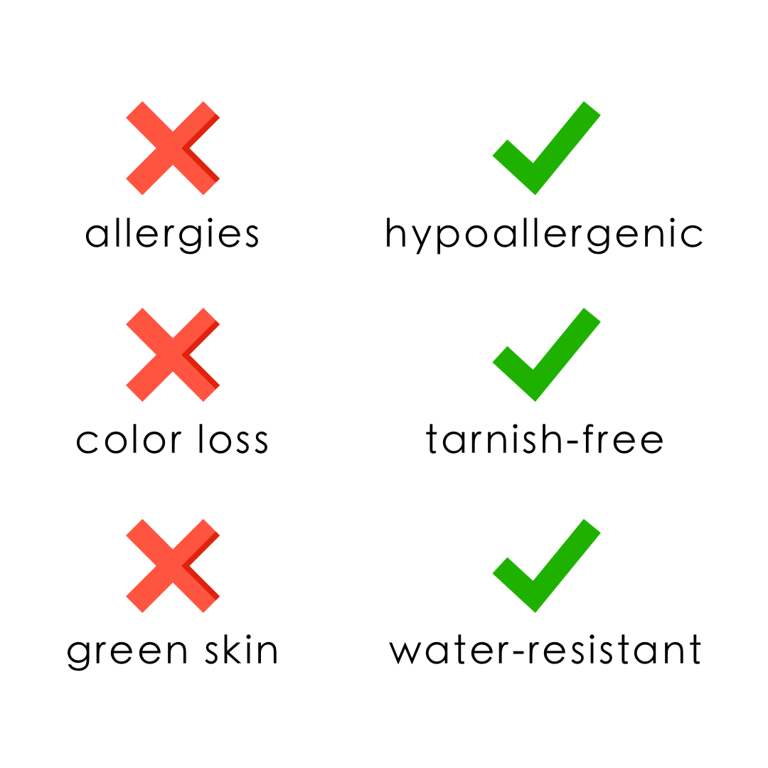 Water, Sweat, and Heat Resistant. (No discoloration, No Tarnishing).